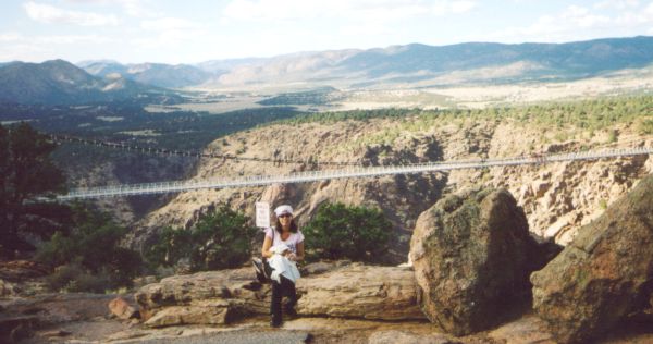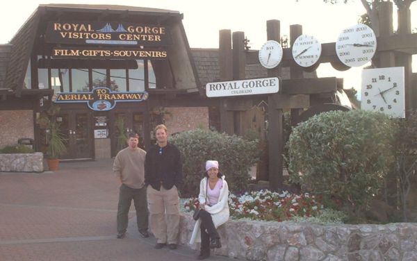 We stop for gas, potato chips, and Cokes at Westcliffe, and I wish we had spent more time there. Just out of Westcliffe, we turned north on a back road and wound up and down and around for over an hour, followed Oak Creek, then crossed a divide and were blessed with a great view of Caņon City in the valley below. The road down was a little scary, and when we hit town, we passed the Train Station and were tempted to ride up to Royal Gorge. The day had worn on, however, so we pressed on to bridge, which had turned into an amusement park since the last time I had been there so many years ago. |